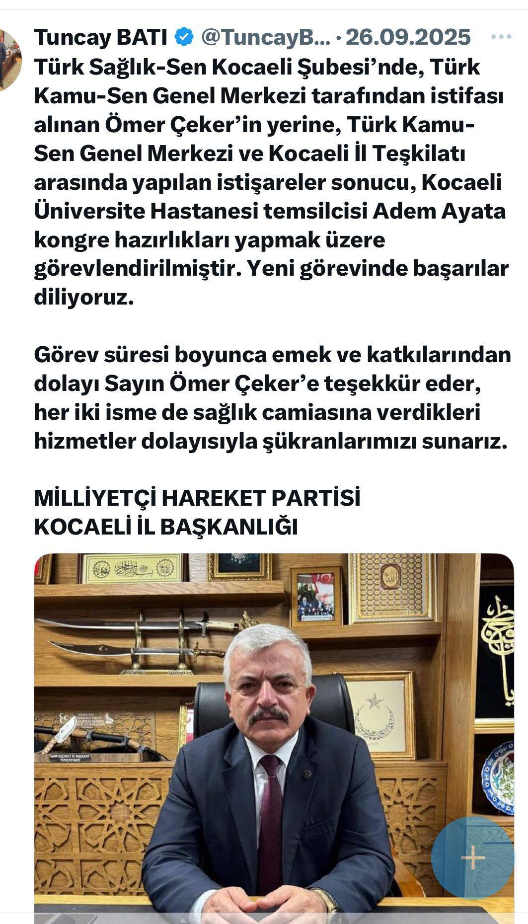 Türk Sağlık Sen Genel Merkezinin bugüne kadar binlerce basın açıklaması ve eylem yaparak sayısız kazanımlar elde etmiş Kocaeli Şube Başkanı Ömer Çeker’i görevden alması tepki çekerken, bu kararı MHP Kocaeli İl Başkanlığı’nın duyurması da ilde şaşkınlık yarattı!Türk Sağlık Sen Şubeleri arasında sağlık emekçilerinin hakları, kazanımları ve sorunları adına en çok mücadele eden ve önemli kazanımlar elde eden Türk Sağlık Sen Kocaeli Şube Başkanı Ömer Çeker, genel merkez tarafından sürpriz bir kararla görevden alındı. Böylesine önemli çalışmalara imza atan Türkiye genelinde Türk Sağlık Sen ve Kamu-Sen adına örnek çalışmalara imza atan Başkan Çeker’in genel merkezin kararıyla görevden alınması, sağlık camiasında tepkiyle karşılandı.