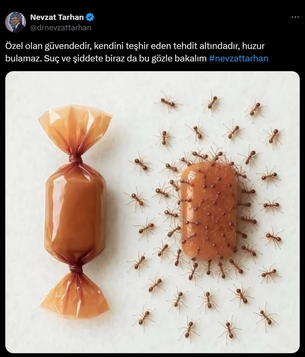 Tarhan, “Kendisini teşhir eden tehdit altındadır” açıklamasının kadınlara yönelik olarak yorumlanmasının ardından üzgün olduğunu belirtti. Nevzat Tarhan, X ve Instagram hesaplarından yaptığı bir paylaşımla sosyal medyada gündeme geldi. Tarhan’ın, Özel olan güvendedir, kendini teşhir eden tehdit altındadır, huzur bulamaz. Suç ve şiddet olaylarına biraz da bu gözle bakalım” ifadelerini kullandığı paylaşımı çok sayıda tepkiye neden oldu.